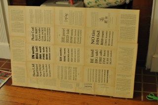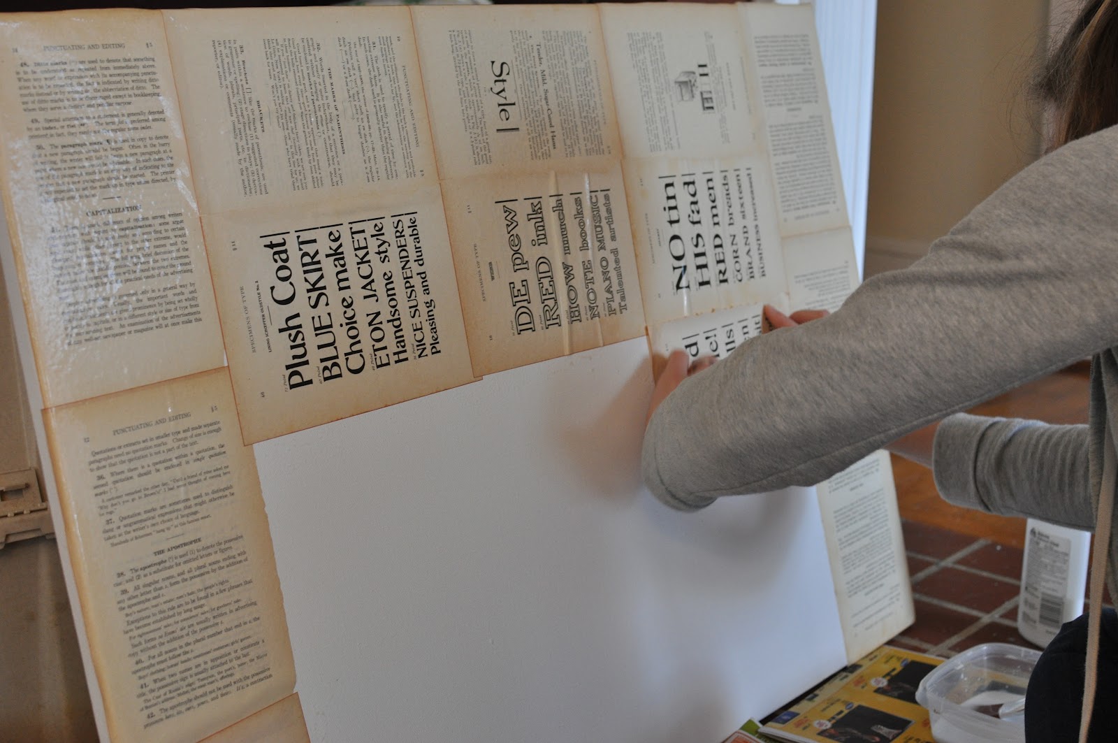 I researched adhesives and methods for this collage before beginning and decided to try watering down white glue and brushing it on the book pages, then brushing it on again over the top of the pages. At first the entire canvas was a wrinkly mess – my best guess is that the canvas was wet and sagged a bit. Once it was dry it was smooth and leathery to the tough.