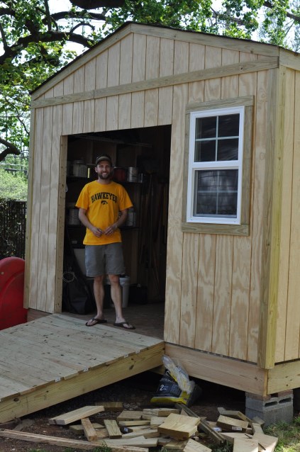Eric standing inside the doorway of the new garage.