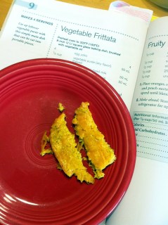 We picked up a used copy of Blender Baby Food by Nicole Young and have used it pretty heavily as well. Yesterday, I created Vegetable Frittata out of said book. The nice thing about this recipe is that you can use up extra vegetable purees and try different combinations for different flavors. Be sure you have tried eggs with your child though – we did have a scary egg reaction earlier this spring.