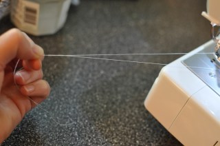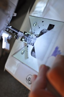 After I cut all my squares it was time to sew. I started by pulling out extra length from the needle and bobbin. This would give me a little extra length to hang my banners.