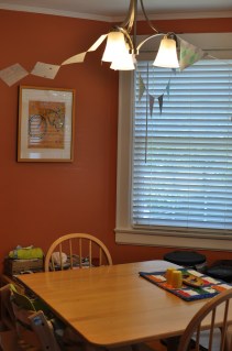 The finished banners look festive in the dining room. I stuck with a purple, green, and brown palette. The dried triangles have a few wrinkles due to the dried glue. This bothered me, so I began searching for other options for banner-like decorations.
