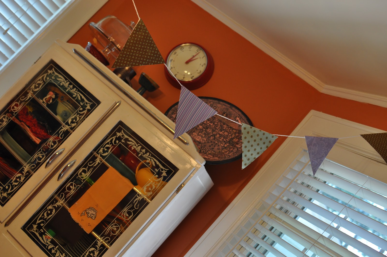 The finished banners look festive in the dining room. I stuck with a purple, green, and brown palette. The dried triangles have a few wrinkles due to the dried glue. This bothered me, so I began searching for other options for banner-like decorations.