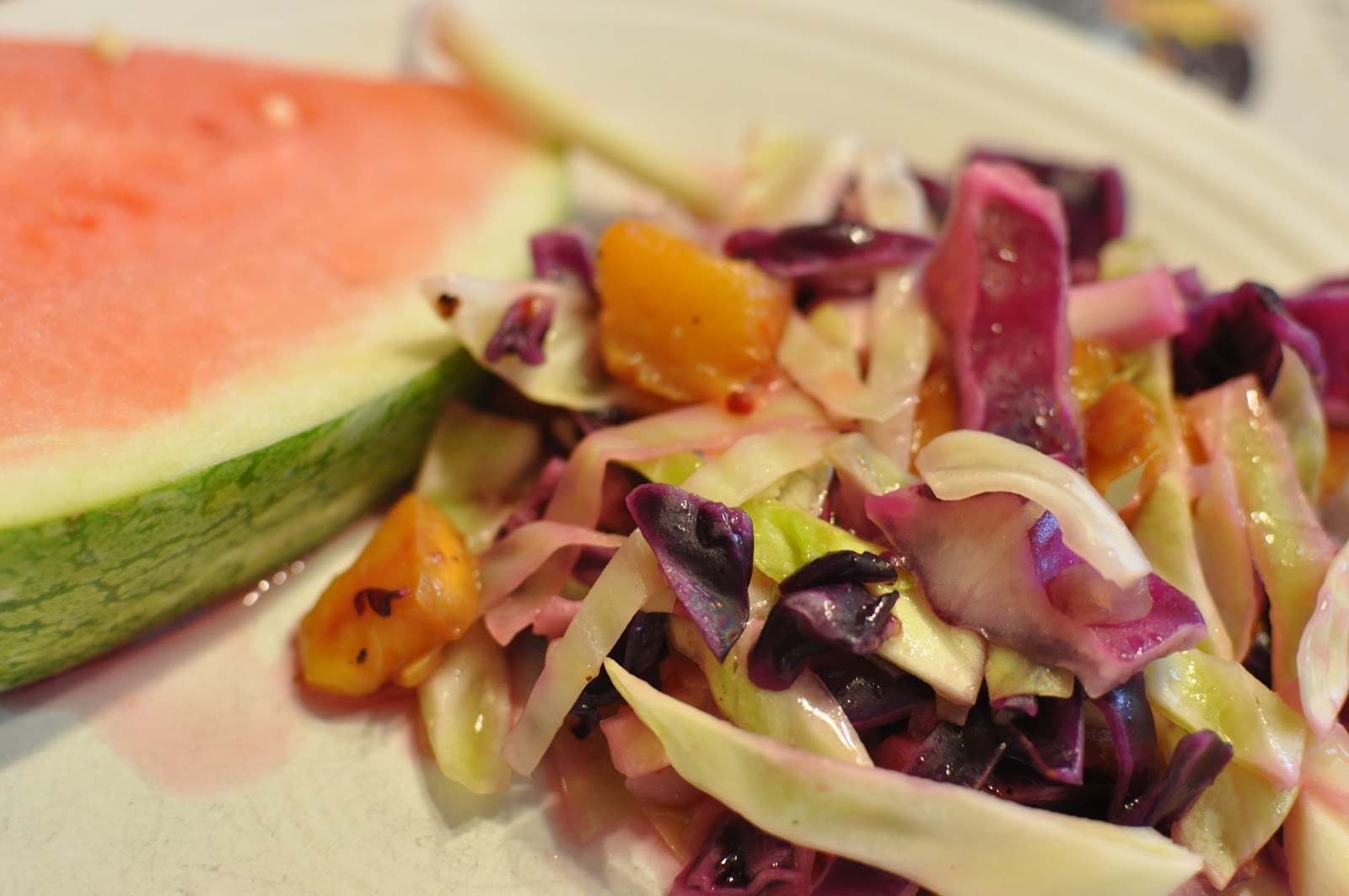 We also served sliced watermelon, chips, and this amazing sweet and zingy Peach-ginger Slaw from Southern Living, July 2012. We skipped the pecans to keep this recipe nut-free for those not liking or able to eat nuts. See the recipe below.