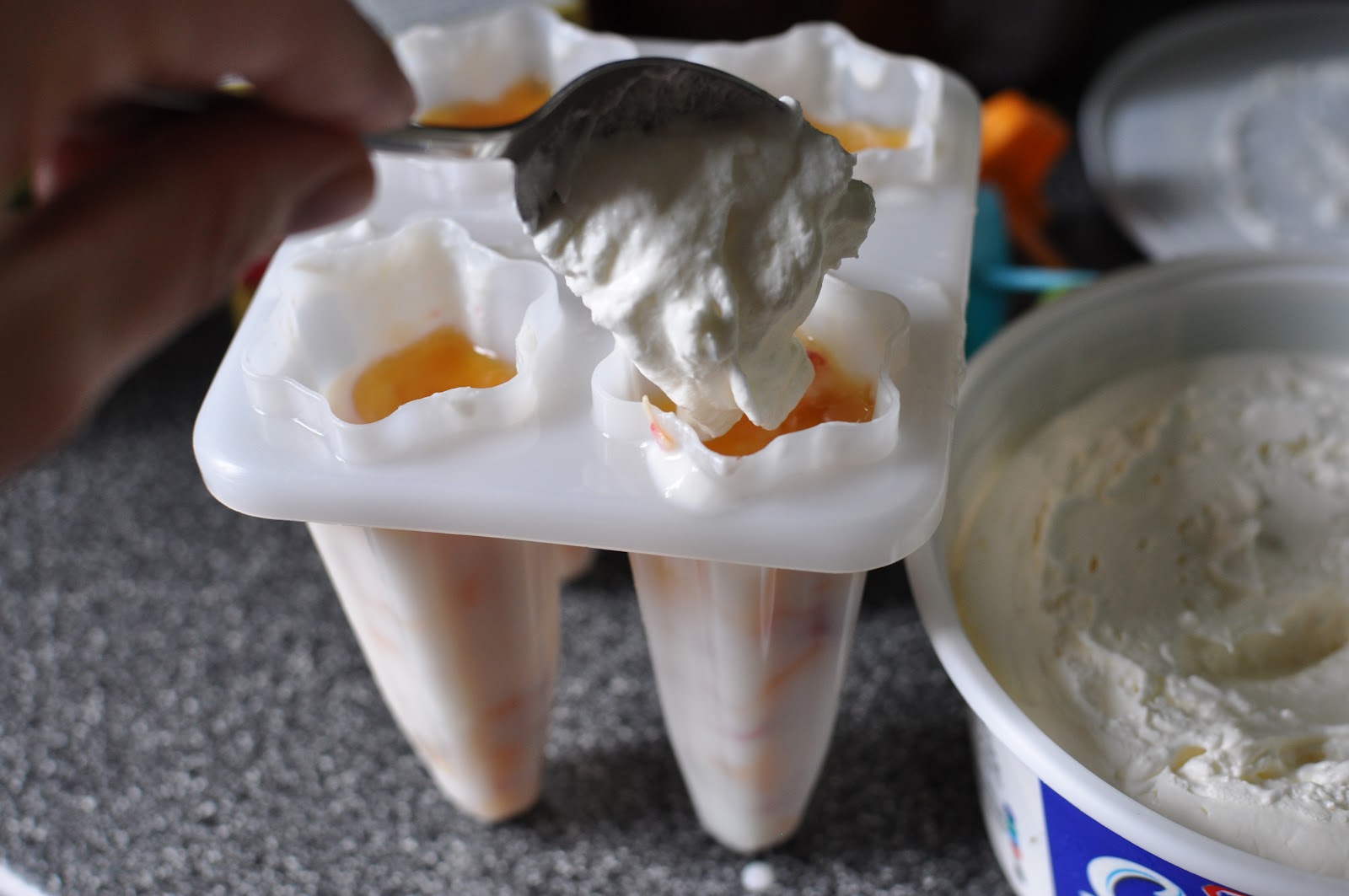 Fill the popsicle molds almost to the top (I know, I know this recipe is uber scientific). If you have extra filling, get a spoon.