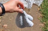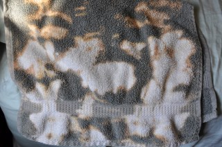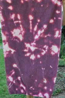 Tie with twine in at least two locations. I did not soak this towel before bleaching, so the design did not come out as strong as it could have.