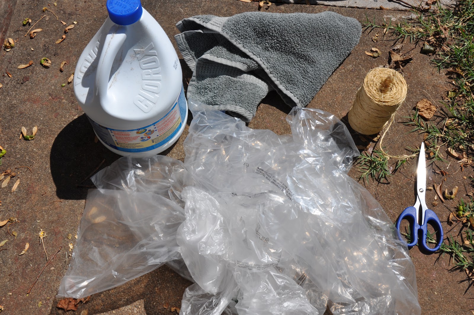 Supplies needed: bleach, old towel, twine, plastic bags, plastic tarp, scissors, and gloves.