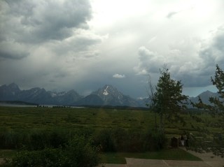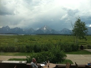 The first evening at Jackson Lake Lodge gave us pretty dramatic panoramic shots. This is the view from the main lobby’s tremendous soaring windows. This truly may be the world’s best bar – you simply can’t beat a patio with these views. The patio also happens to be the perfect early morning wildlife viewing vantage point.