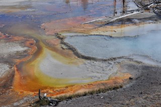 The run-off from Grand Prismatic is a vivid orange. This is due to the thermophiles that thrive in the hot waters of this hot spring. The center is a blue, fading to a greenish, then to yellow, and then orange and red. Here is a nice aerial view of this well-known hot spring.