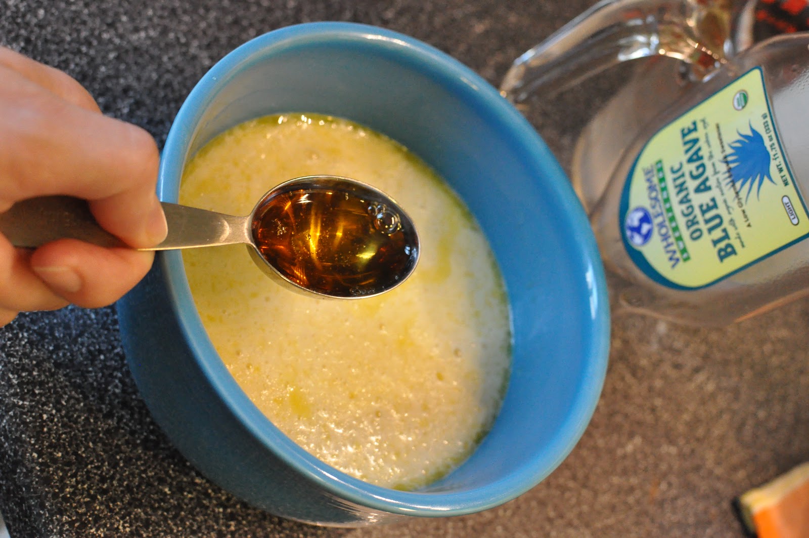 I swapped out the sugar for agave syrup. This isn’t a big deal when the amount of sugar is minimal, otherwise you do lose volume.
