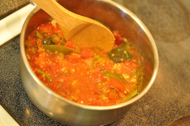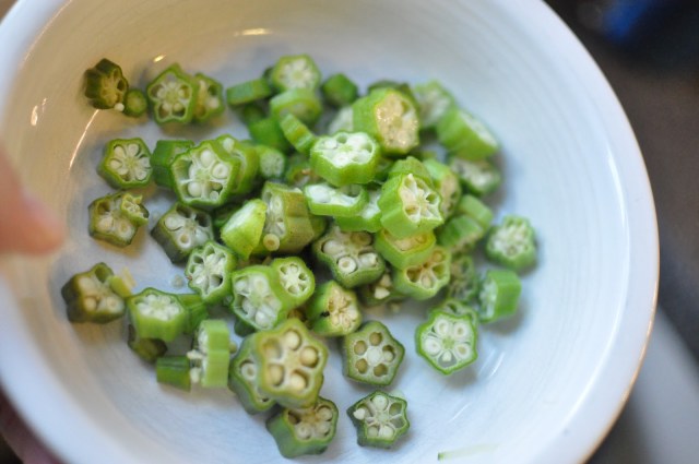 Next, I added sliced okra. You can read more about okra in an older post, here. I let the okra and zucchini saute for about 5 minutes.