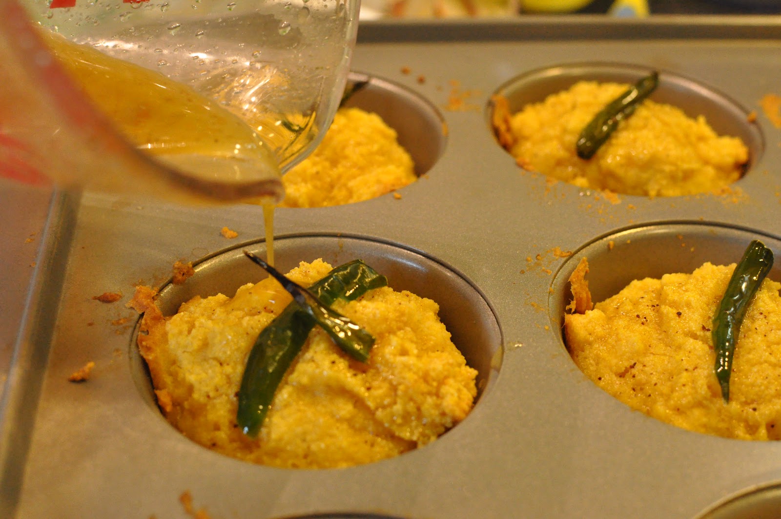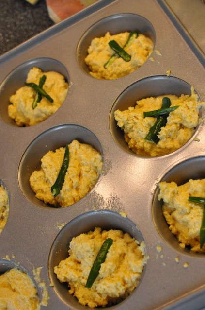 I scooped the batter into 11 oiled muffin tins and added my sliced peppers on top.
