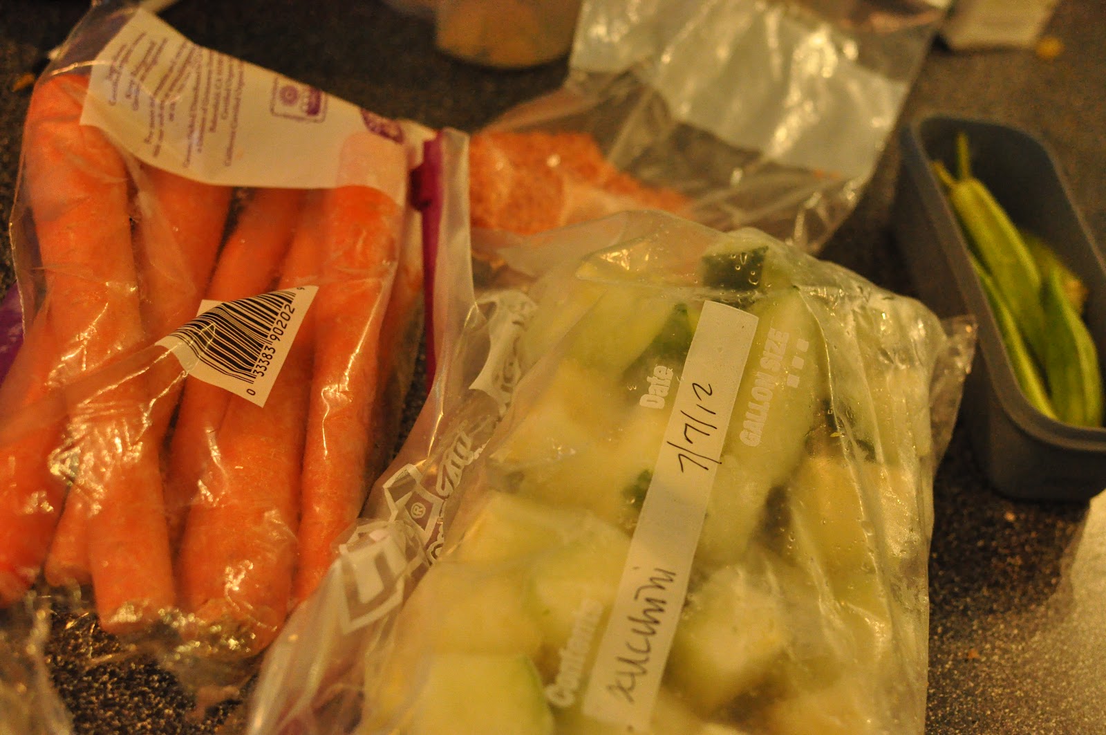 Next up, the main entree. I had some fresh okra and green beans from the garden, plus some frozen zucchini from a friends’ garden. This was the starting point, and I added in a few other things, but ultimately decided against the carrots in the end.