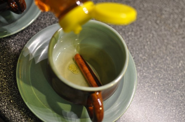 3. Next, add 1 shot ( ~ 1 oz.) of bourbon per cup. Add a drizzle of honey and one cinnamon stick.