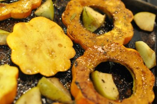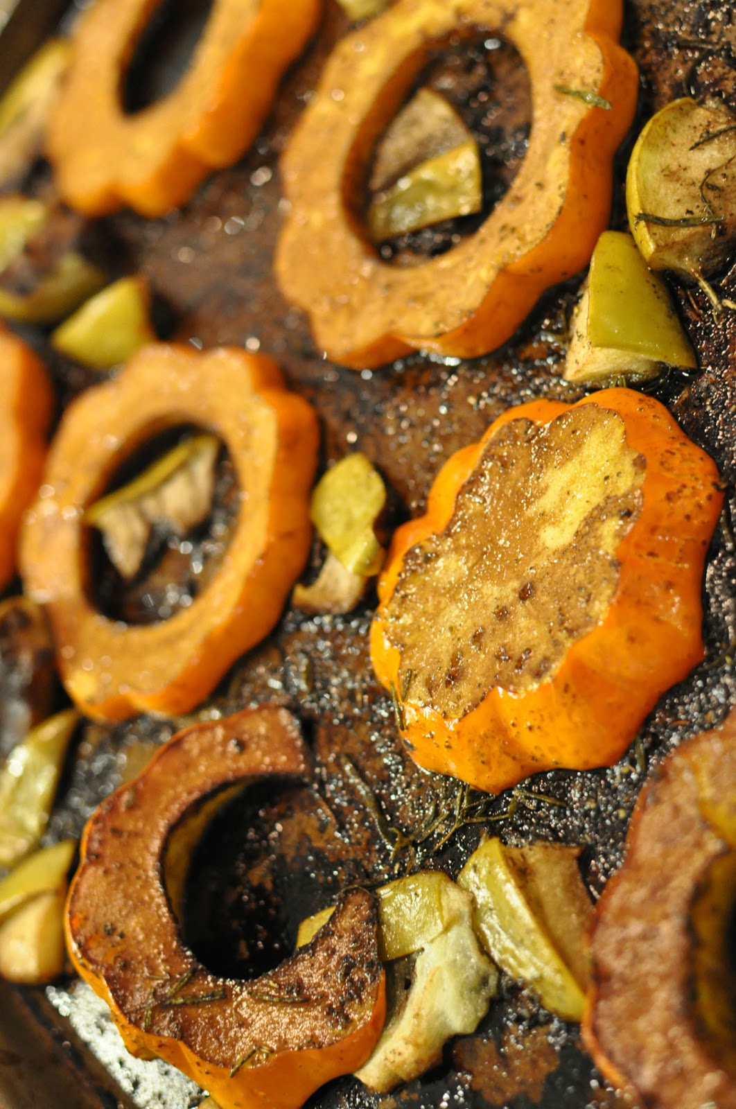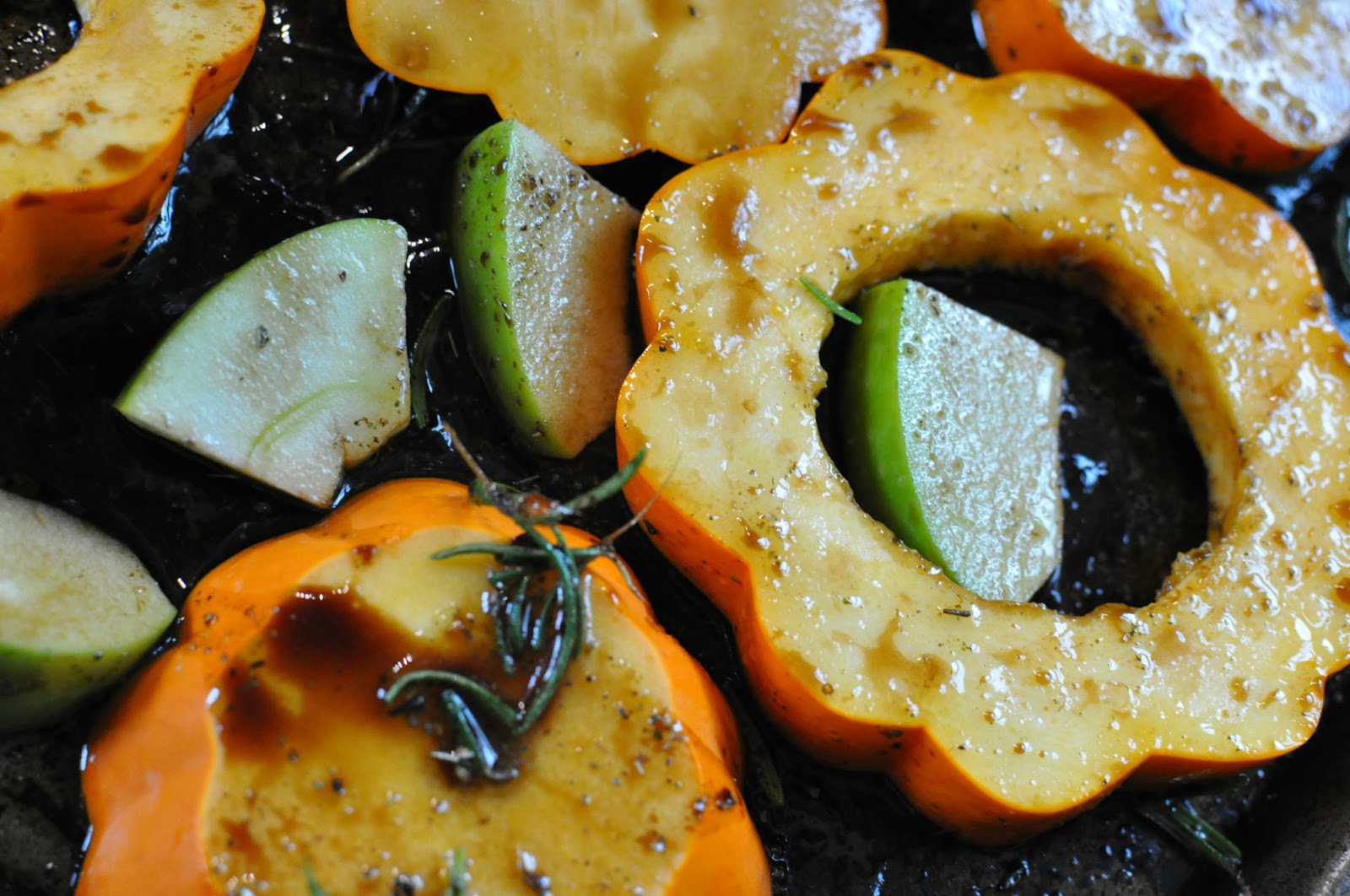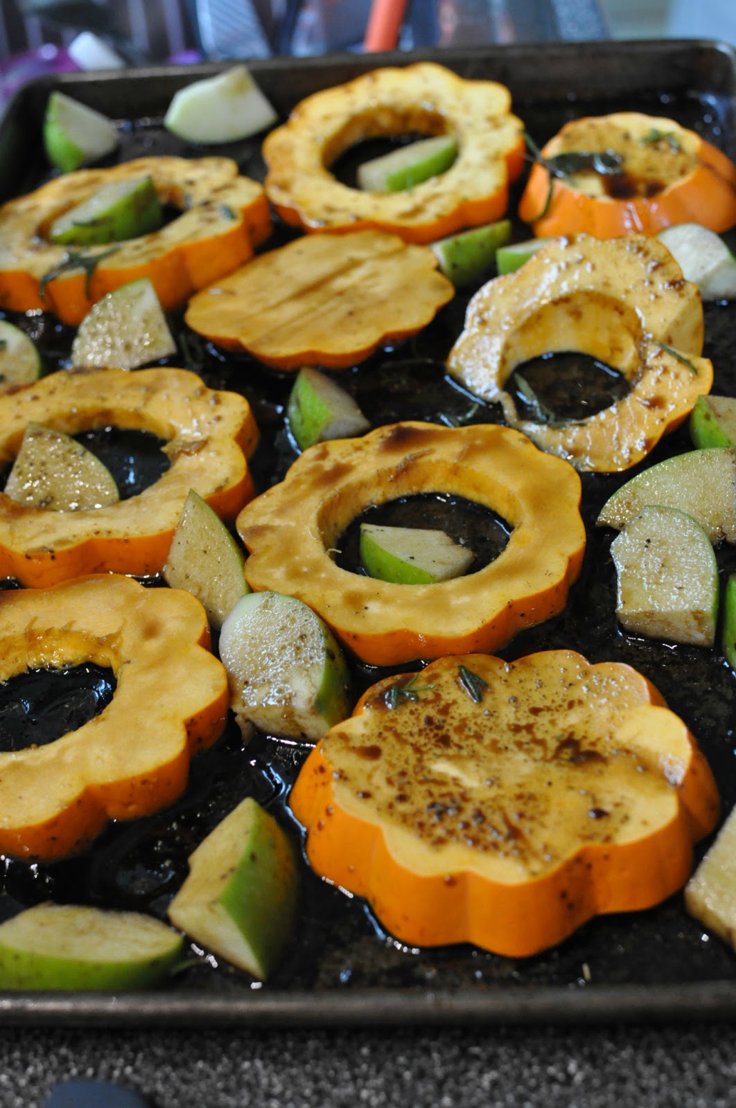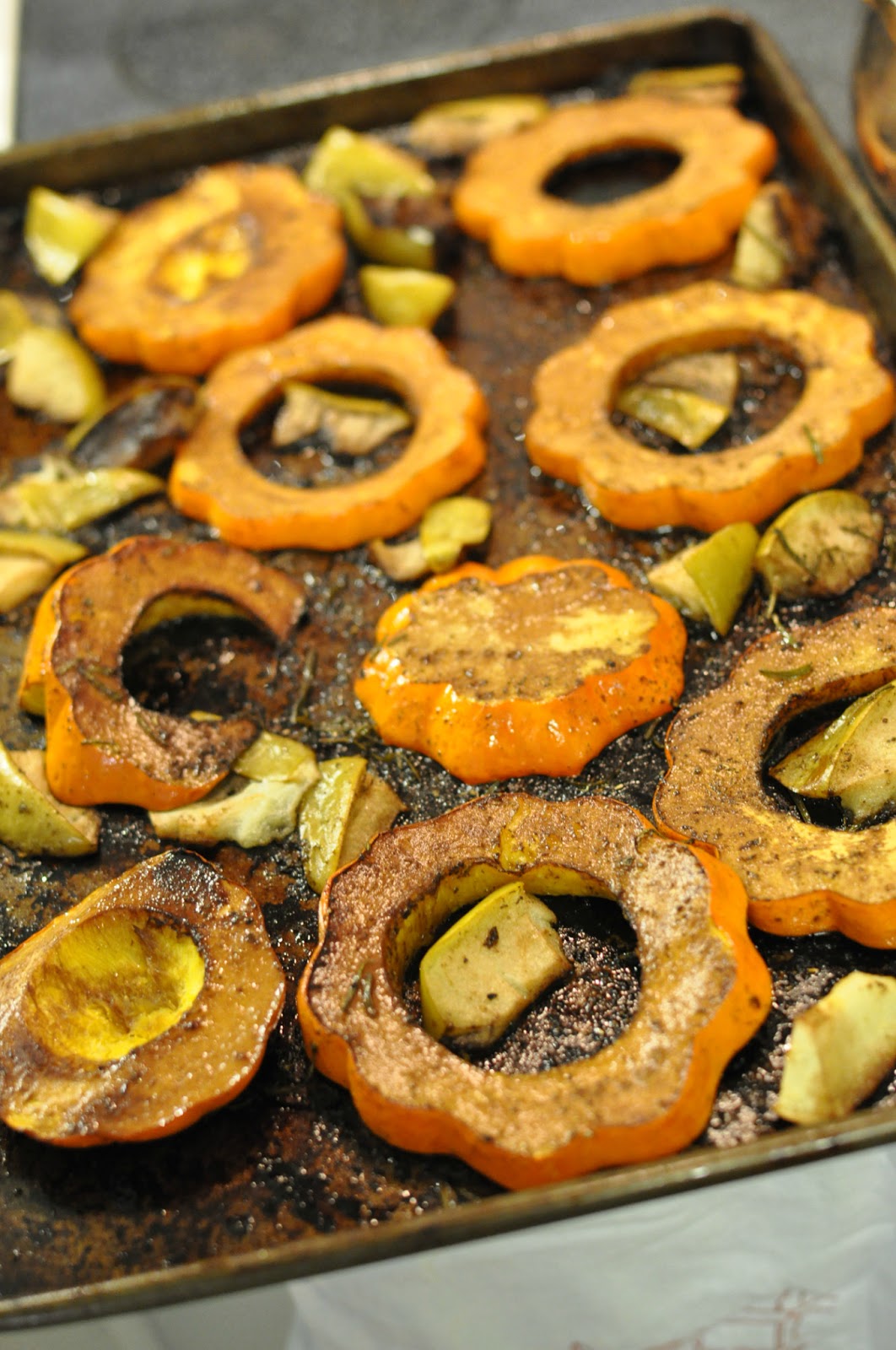 1. Slice one golden acorn squash in half. Scoop out the seeds and then cut into rings. Place the rings on a rimmed baking sheet. Slice one Granny Smith apple into larger chunks, place on the rimmed baking sheet.