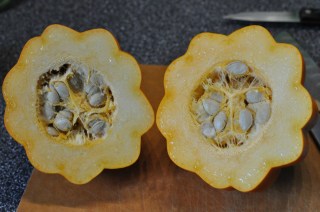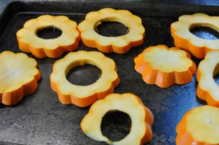 So, back on the home front, I decided to try something different with my golden acorn squash. First, slice one golden acorn squash in half. Scoop out the seeds and then cut into rings.