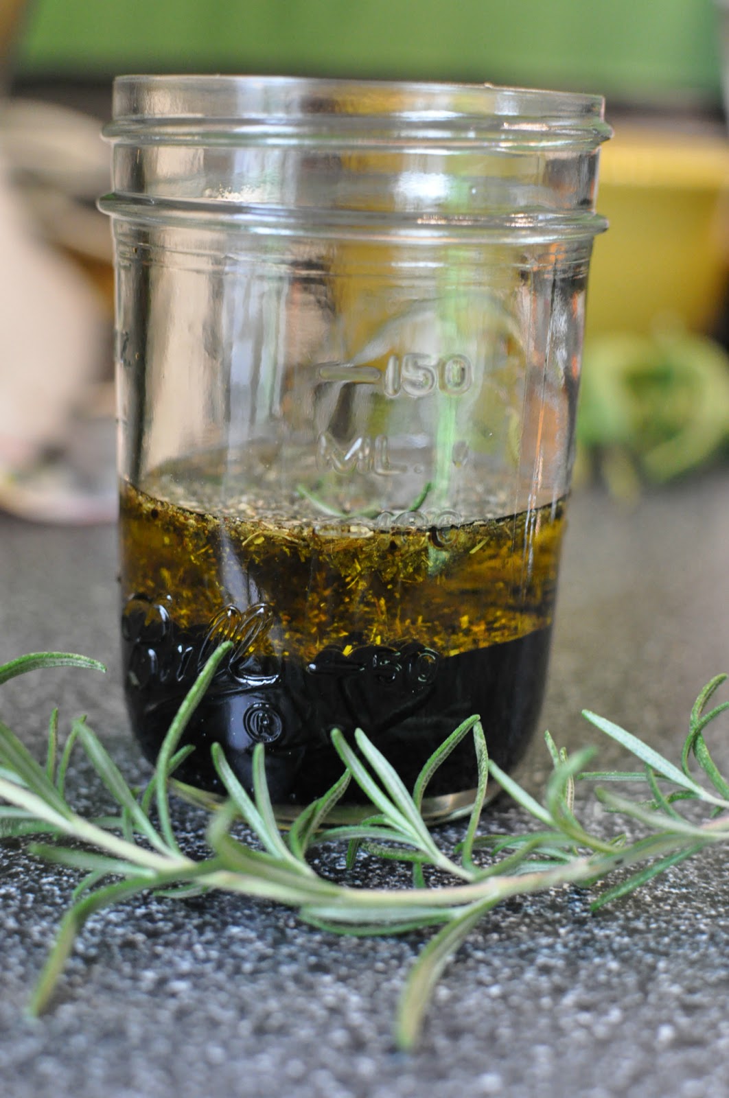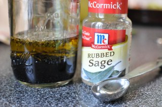 2. In a small jar, 2 oz of olive oil, 2 oz of balsamic vinegar, 1 teaspoon of sage, 1 sprig of rosemary, stems removed, freshly ground pepper and salt to taste, and 2 oz of water. Place lid on jar and shake well. Pour over the squash and apple mixture, flip to ensure both sides are well coated. Let marinate for at least 30 minutes.