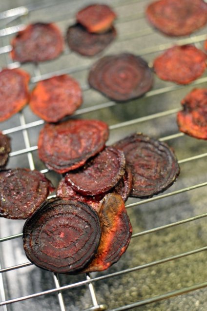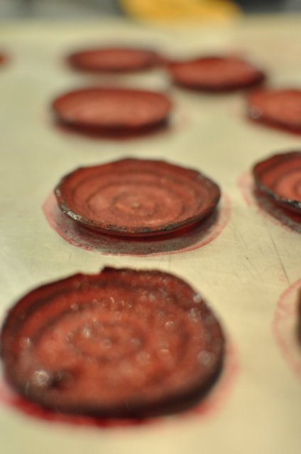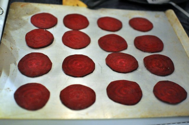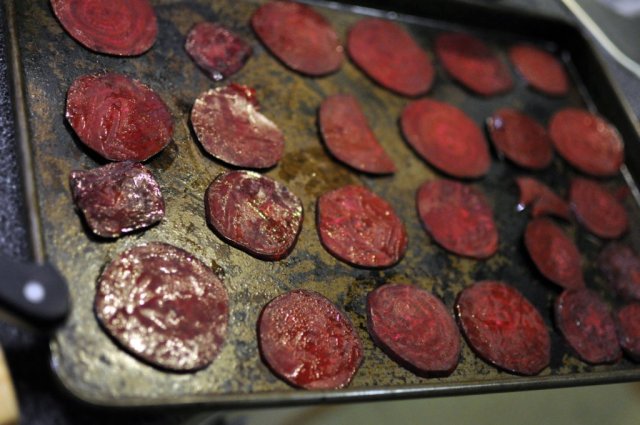 I was surprised by how much the beet chips shrank over the baking period – there are two rings visible from the two baking lengths.