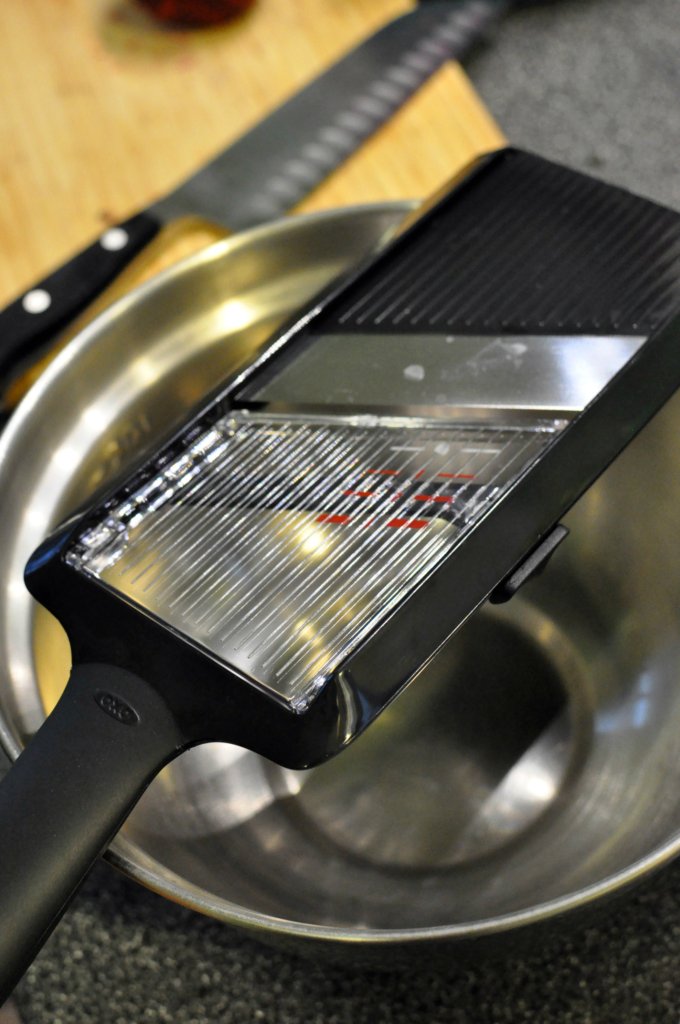 Using a mandoline, slice beets on the thinnest setting, such as 1/16.”