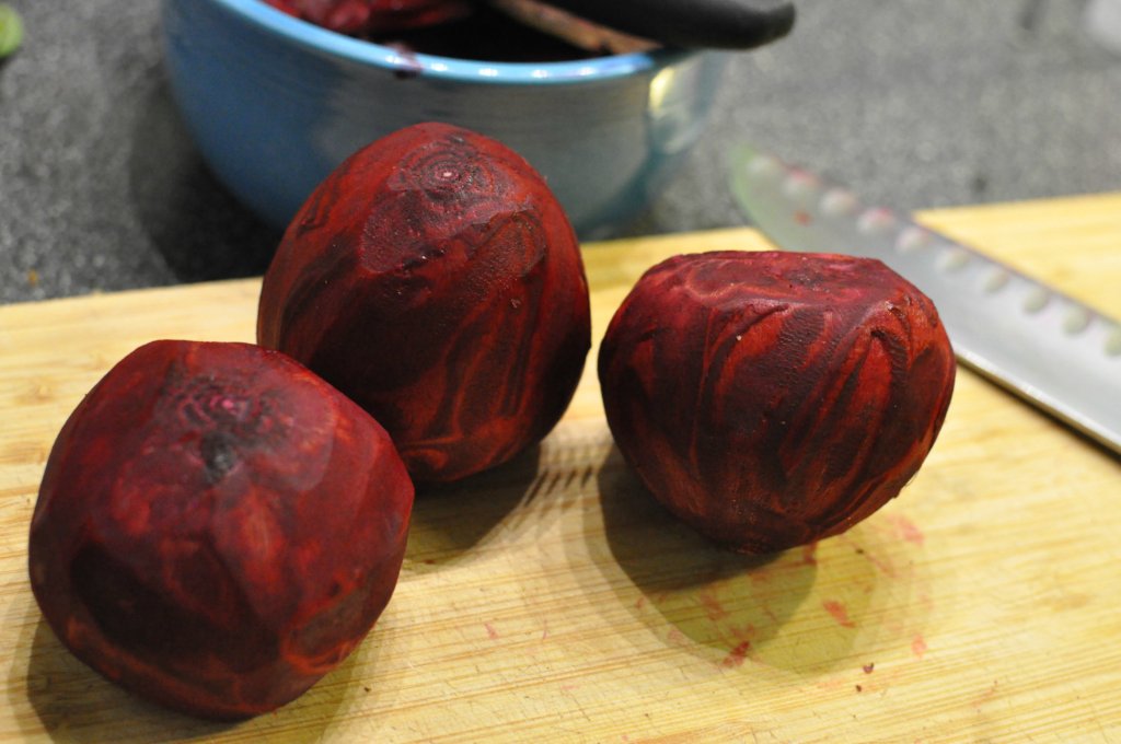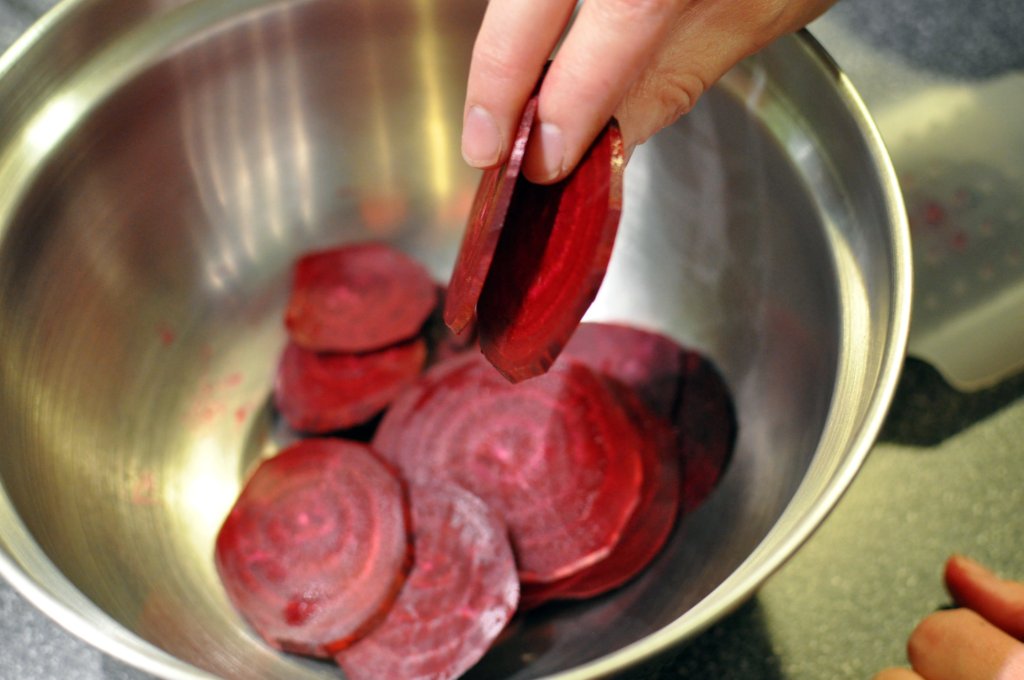 1. Peel 3 beets. Using a mandoline, slice beets on the thinnest setting, such as 1/16.”