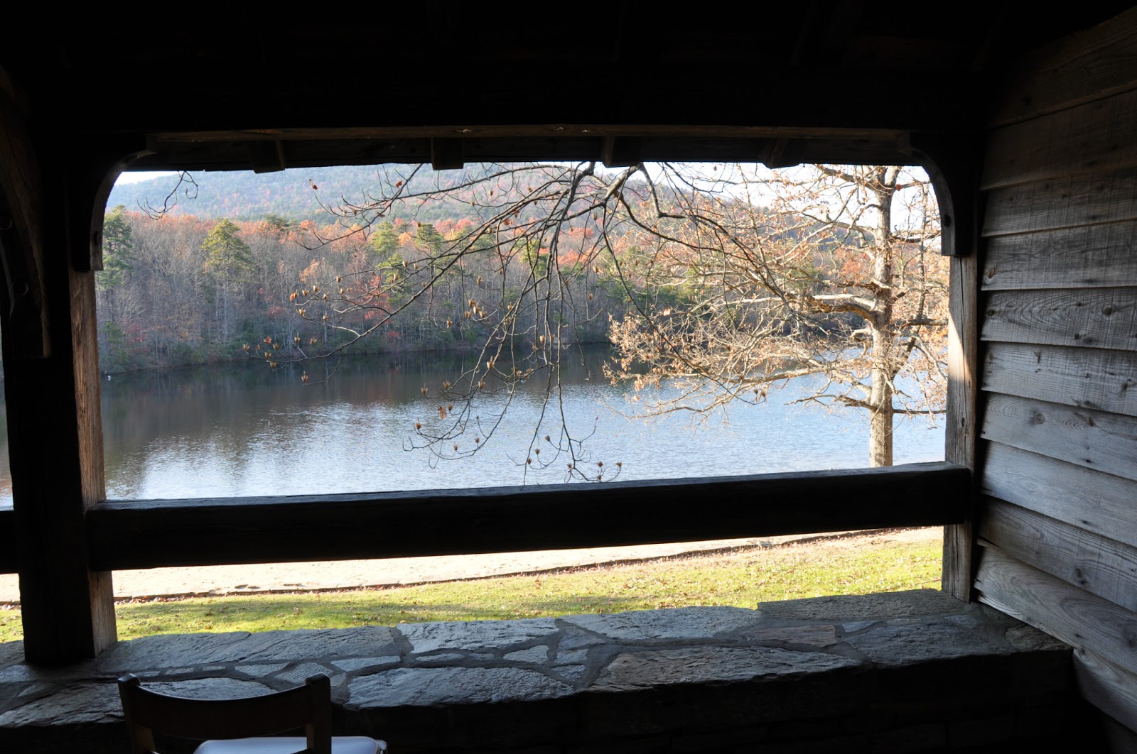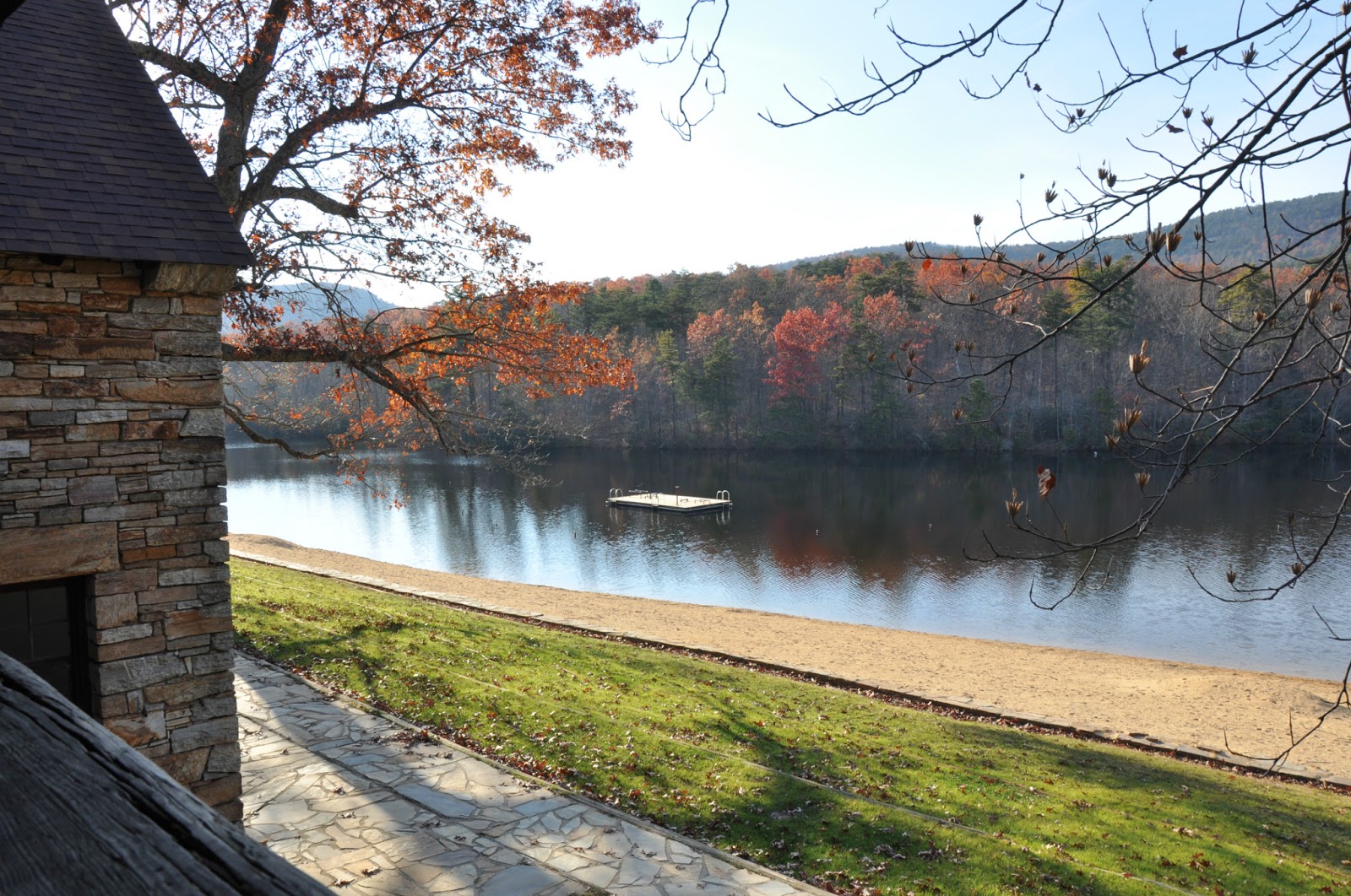 I always say this is one of the most beautiful park parking lots I’ve been to – full of mature trees, granite stone walls, and lake and Sauratown Mountain views.
