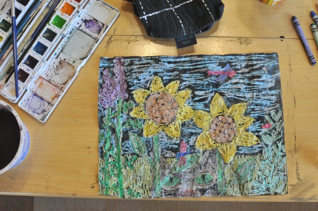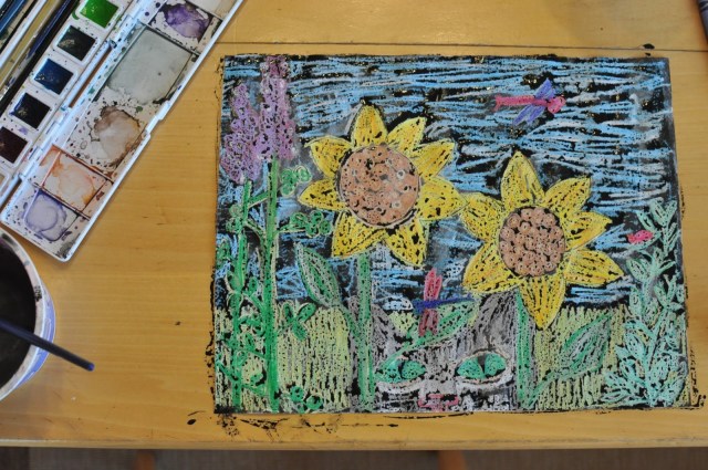 Step 2: Cover entire paper in black watercolor paint. You try other darker colors as well, but black will create the most vibrant contrast. The paint will not stick to the waxy crayon, but rather resist and bead up on top of the crayon. The paint will fill in small areas left untouched by crayon. My students always ooh and aaah over this resist technique – it truly is magic!