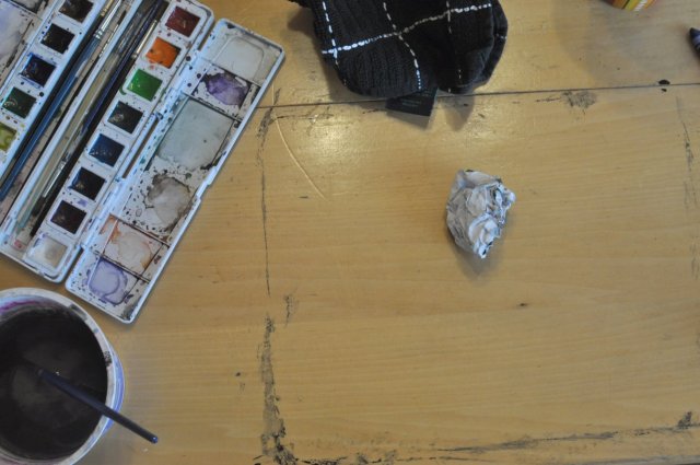 Step 3: Blot any excess puddle of paint off of paper with a rag or paper towel. Then, crumple the paper into a ball. This crumpling is what will give the look and feel of fabric for the batik style. Notice the outline on the table – if you are a neat freak, put newspaper or the likes down before starting this project. Otherwise, watercolor paint is very easy to clean up. A wet rag will suffice.