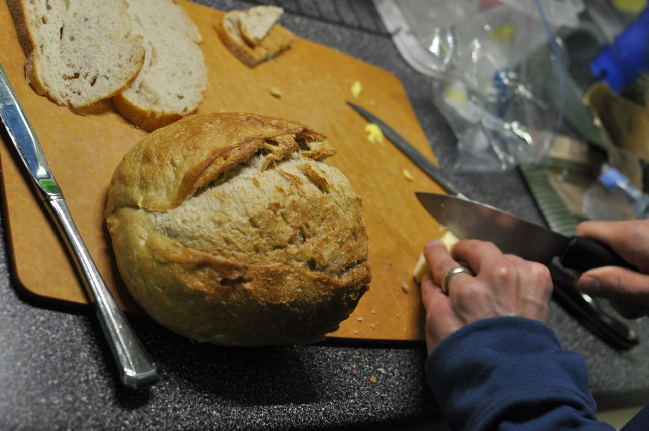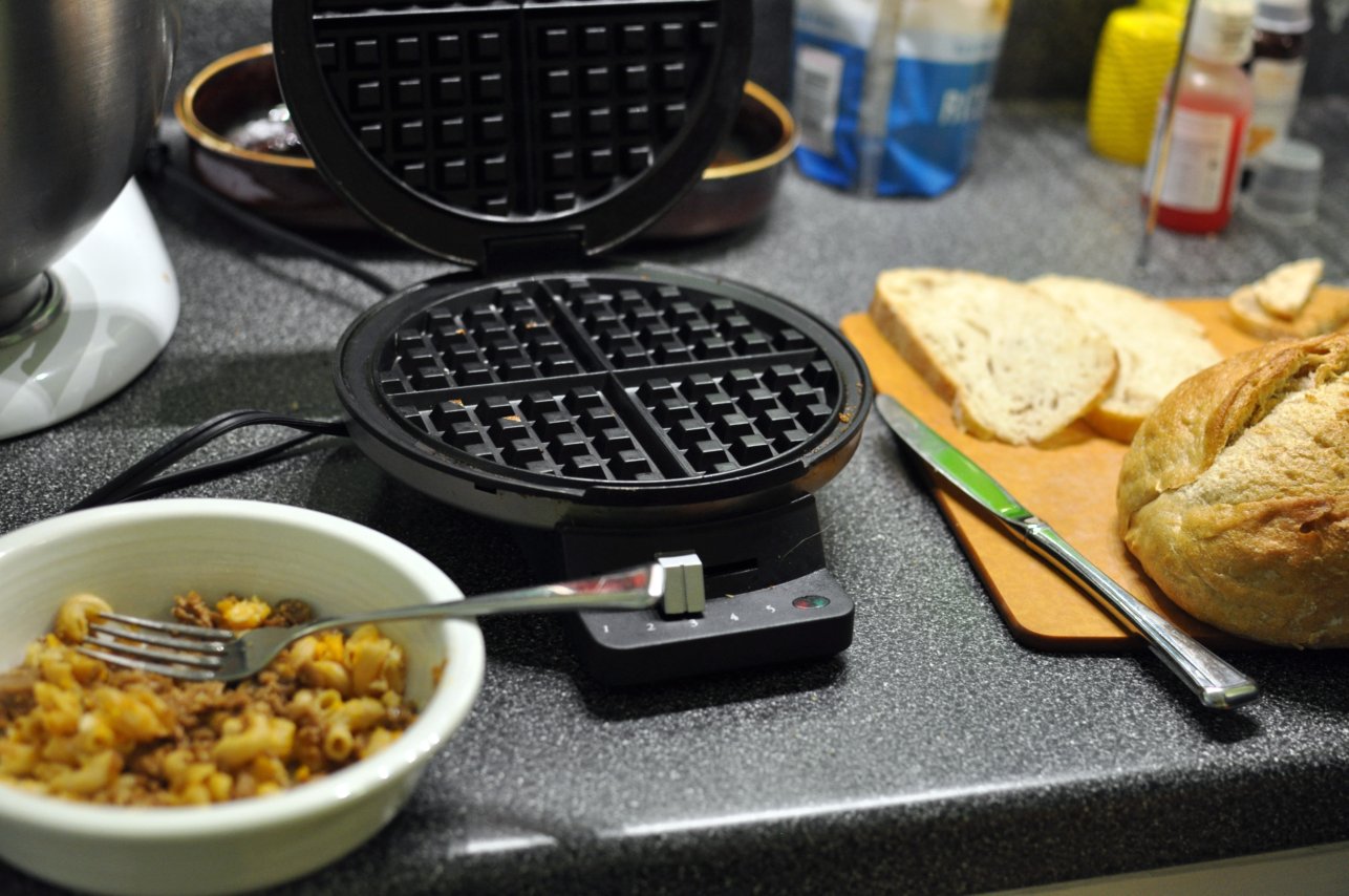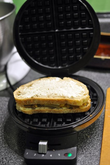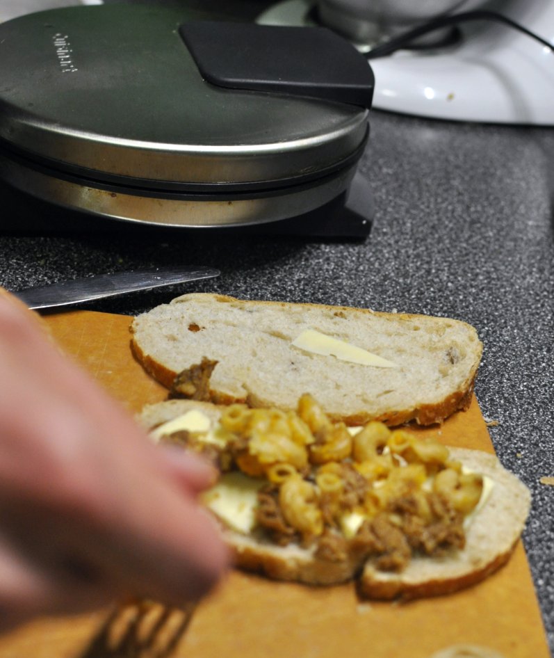 Tonight he took sliced bread and topped it with cheddar cheese and a mixture of leftover Butternut Squash Pasta Bake mixed with fake beef crumbles.