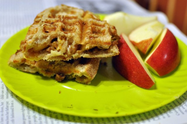 Place on preheated waffle iron, press closed, and cook until light changes from red to green.