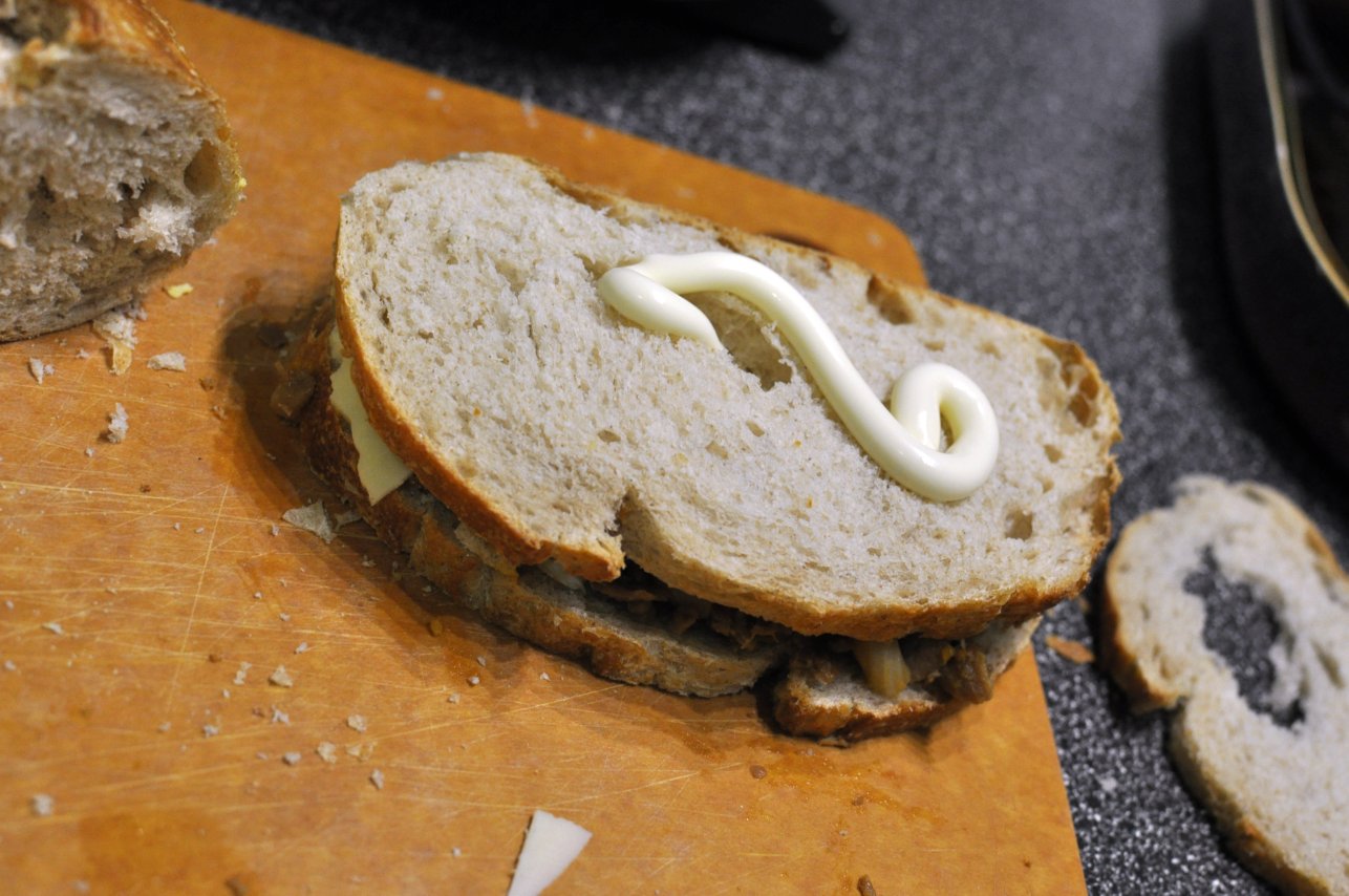 Then he added a large dollop of mayo and spread it evenly on both sides.