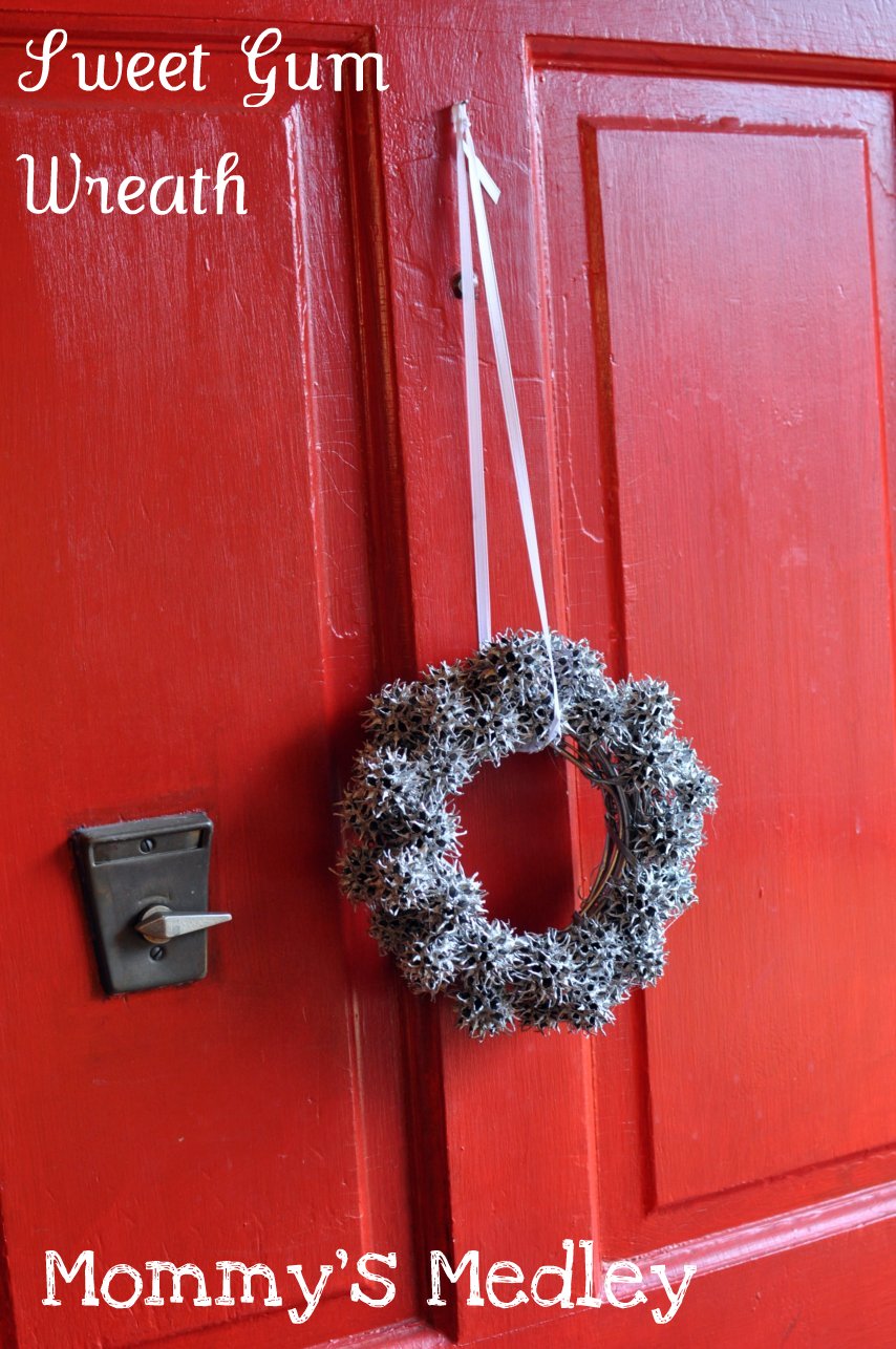 This wreath stems from that very project. When I moved from the Midwest to North Carolina I found these gumballs all over my neighborhood and I quickly put them to use for a pretty wreath for my front door.