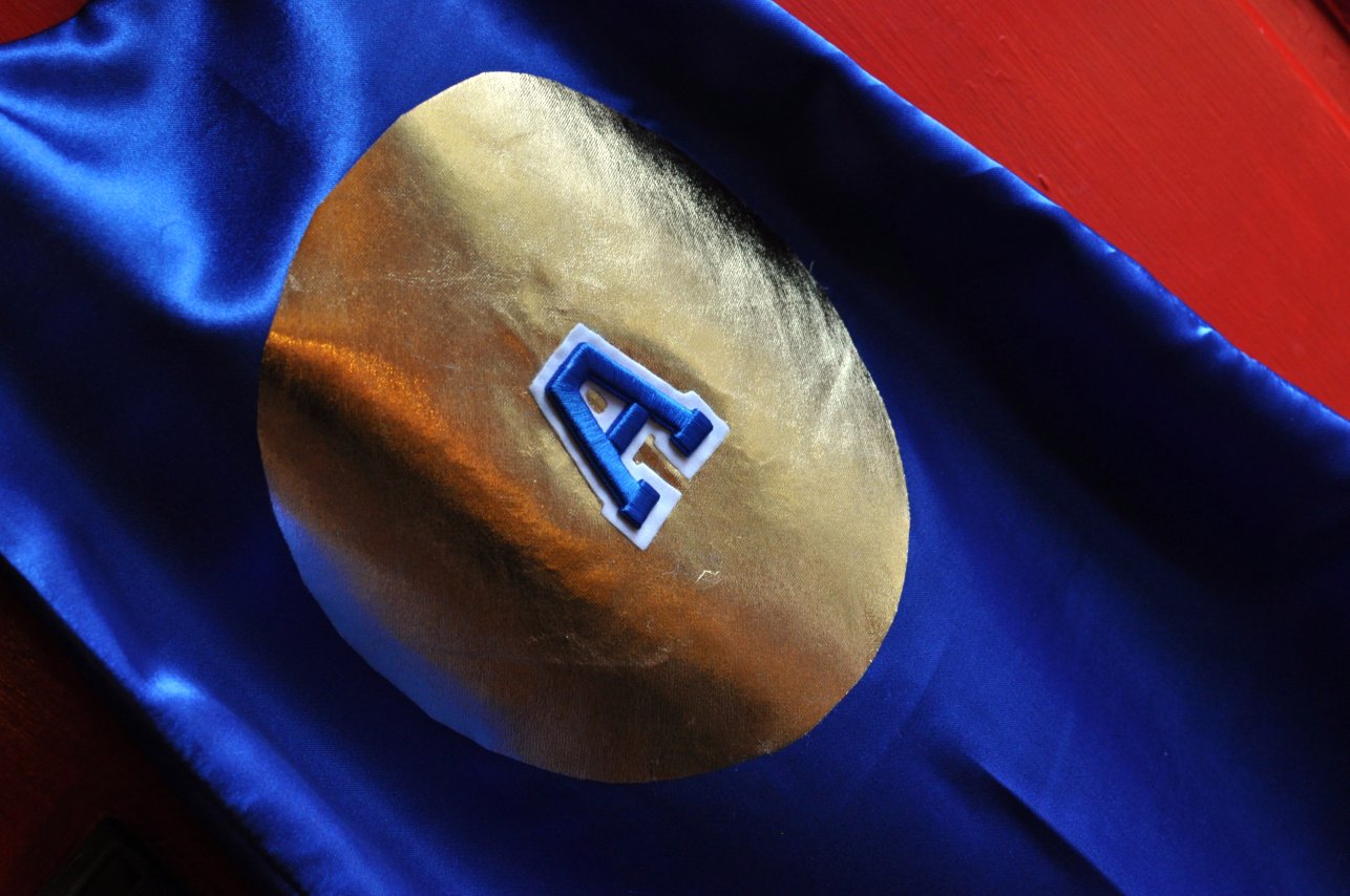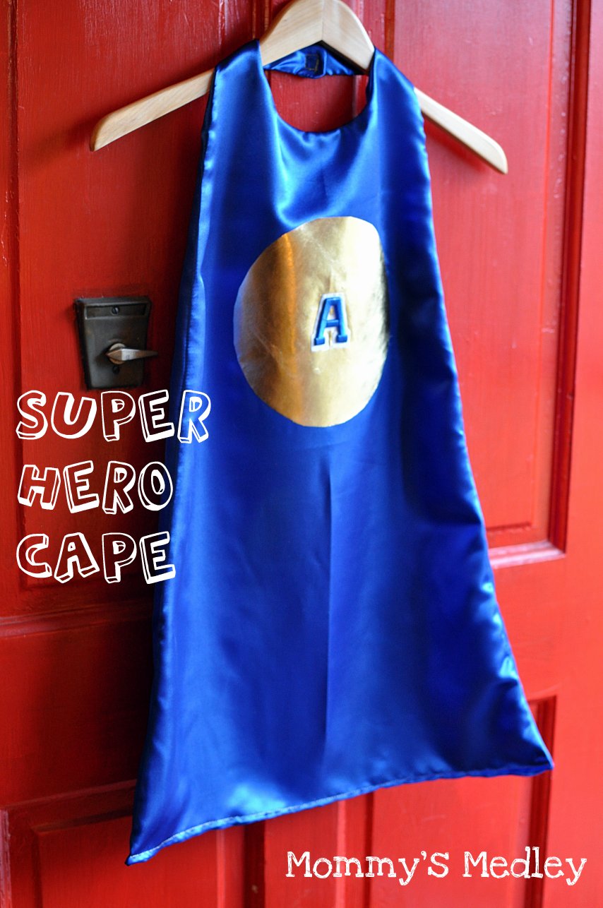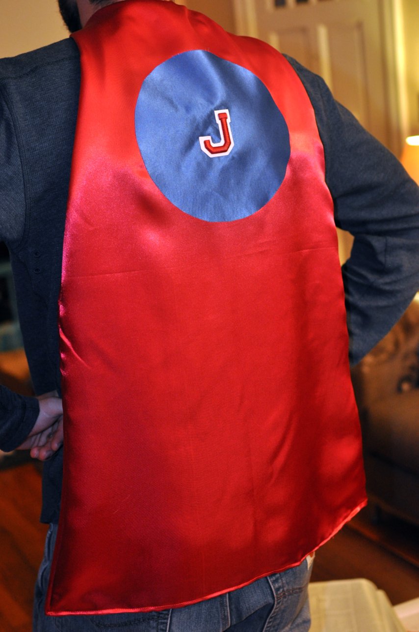 The slippery fabric gave me flashbacks to sewing a prom dress and so I may leave this fabric alone for a while after this project. I need to forget how fussy it can be. The iron on letters work great – just be sure to iron them on before you pin, sew or assemble the cape in any way. I cut out both sections of the cape, and then attached the circles with iron on transfer paper, then pinned, and then sewed. This cut down on messy sewn hems with slippery icky fabric. Can you tell I am not a fan of this fabric? Give me felted wool or cotton any day!