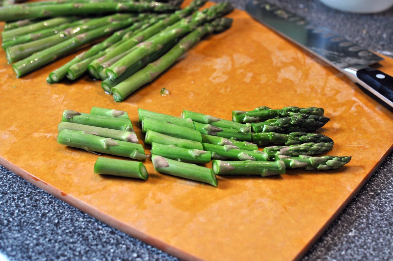 1. Chop 1 bunch of asparagus into sections. Discard lower, white ends. These will be woody, you should be able to feel the difference in texture with your knife. Saute over medium-low heat with 1 tablespoon of olive oil until asparagus is tender.