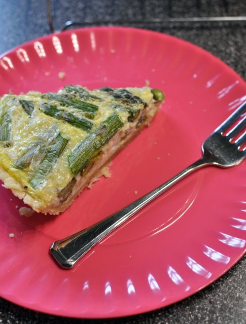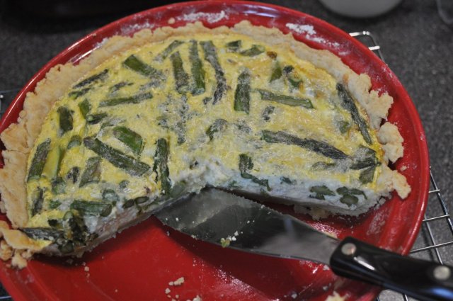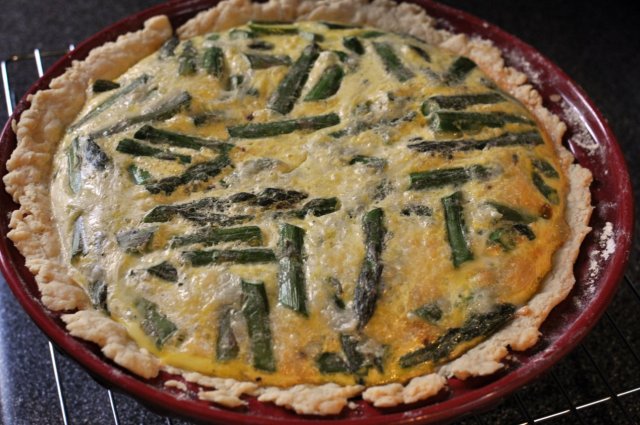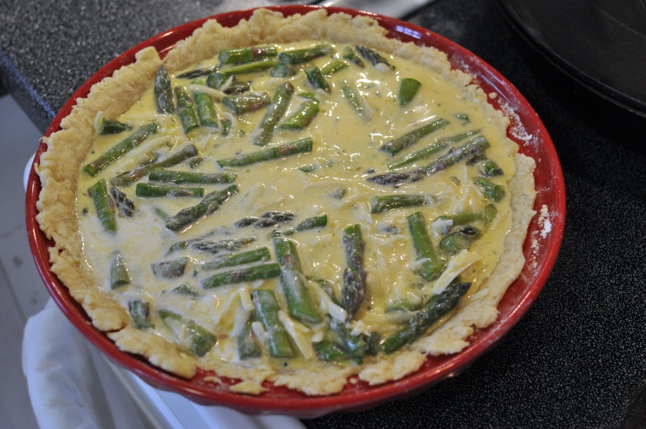 Pour filling into prepared and baked crust. Use a spatula to spread out asparagus evenly.