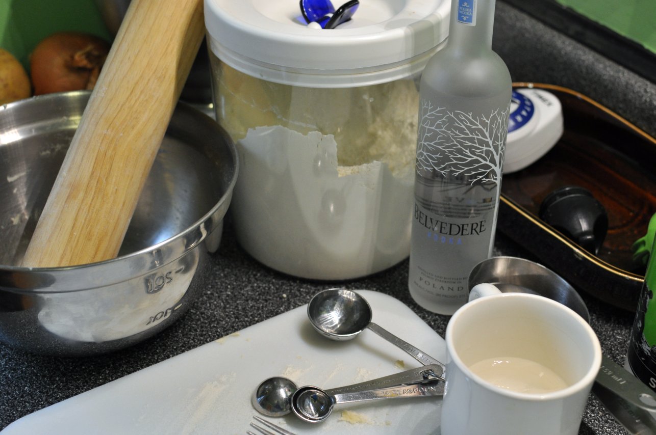 2. Sprinkle 1 tablespoon cold vodka over part of flour and butter mixture. Toss gently with fork. Push moistened dough to one side of bowl. Repeat using 1 tablespoon at a time (4-5 tablespoons vodka/ice water total) until all flour is moistened. Form into 1 disk.