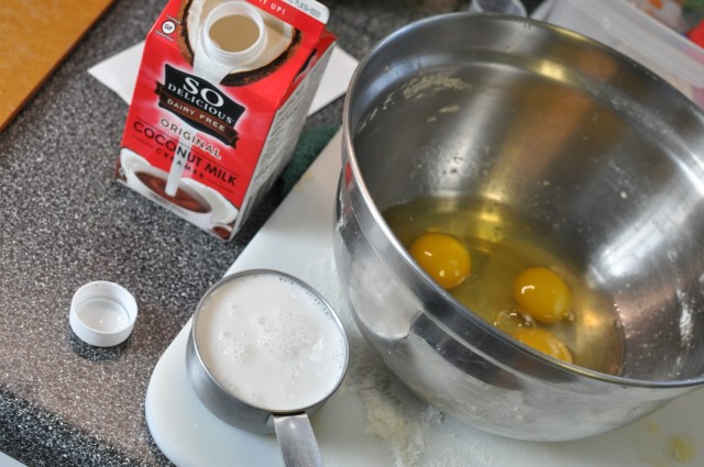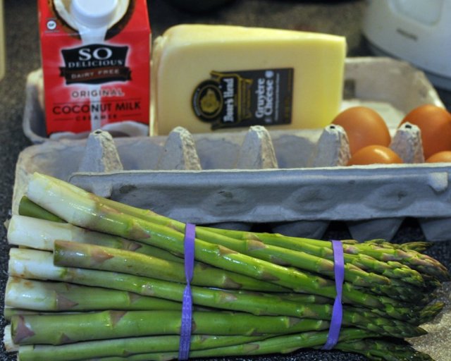 Whisk together 4 eggs, 1 cup coconut creamer, chopped asparagus, and 4 oz of grated Gruyere cheese.