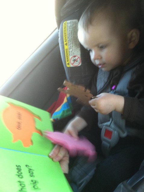 Brownie kept watch on the Iowa countryside during a traffic jam. The hawks were keeping her entertained.