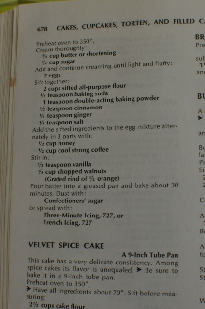 3. Add the sifted ingredients to the egg mixture alternating in three parts with 1/2 cup honey and 1/2 cup cool strong coffee. Stir in 1/2 teaspoon vanilla.