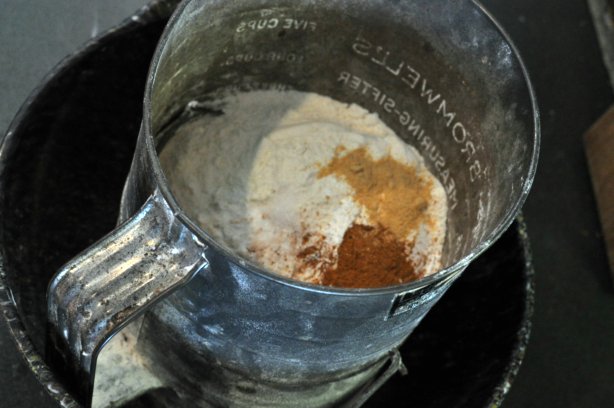 2. Sift together 2 cups all-purpose flour, 1/2 teaspoon baking soda, 1 teaspoon double-acting baking soda, 1/2 teaspoon cinnamon, 1/4 teaspoon ginger, 1/4 teaspoon salt.