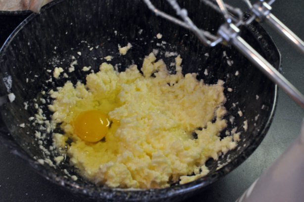 1. Cream together 1/2 cup butter and 1/2 cup sugar. Add 2 eggs and continue creaming until light and fluffy.
