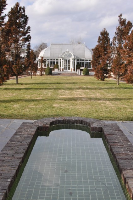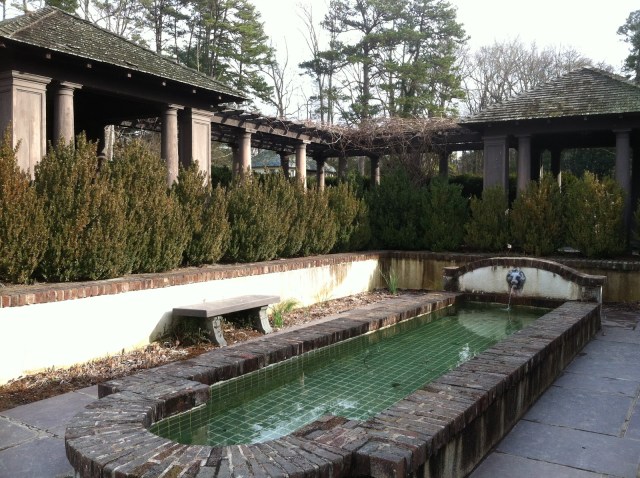 The view looking from the pool, toward the greenhouse and Reynolda Village.
