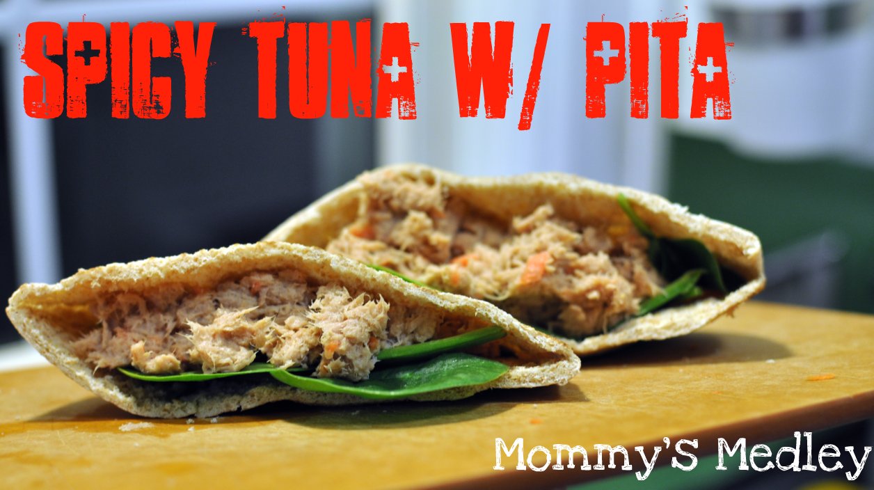 Ok, this is a ‘Take it Easy Tonight, Mommy’ dinner. Those are my favorite meals. It is also a, ‘What do I have in the pantry, fridge and freezer meal?’ I took plain old tuna and dressed it up with some spices and citrus, added some shredded carrot, and put it in a pita pocket with spinach. The spices in this make me want to make tuna more often – I usually don’t opt for tuna because it is on the boring side. Spicy tuna was one of those duh moments for me – in this house we put spices on everything else, why not tuna?