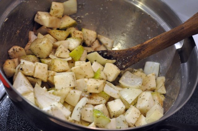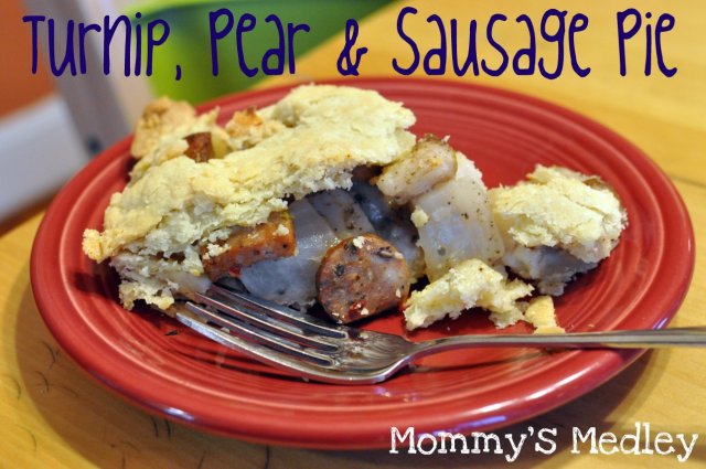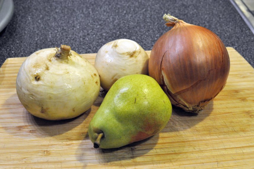 I combined three lovely produce for this pie: turnips, yellow onion, and pear.