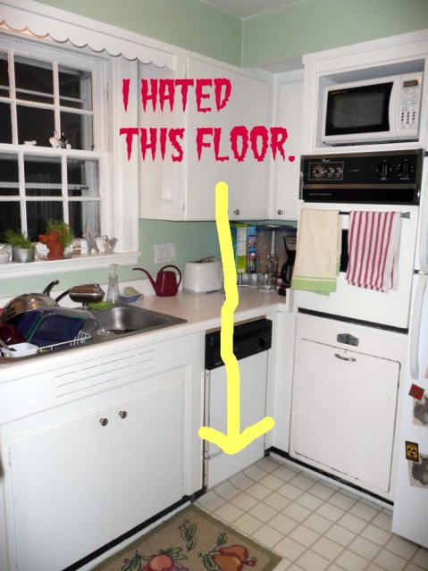 See that curling piece of linoleum flooring under the dishwasher? In the summer of 2009, I took Eric to get Mexican food one night and after a margarita, convinced him we should cut into the floor and see if there were hardwoods underneath. Devious, I know.