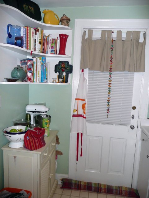The door here goes outside to the garage and driveway area. The built-in shelves hold cookbooks and extra kitchen wares. The dresser below came with the house and held flour, sugar, and extra baking items.