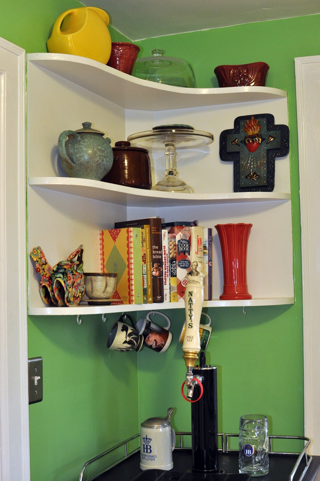 The door here goes outside to the garage and driveway area. The built-in shelves hold cookbooks and extra kitchen wares. The dresser below came with the house and held flour, sugar, and extra baking items.