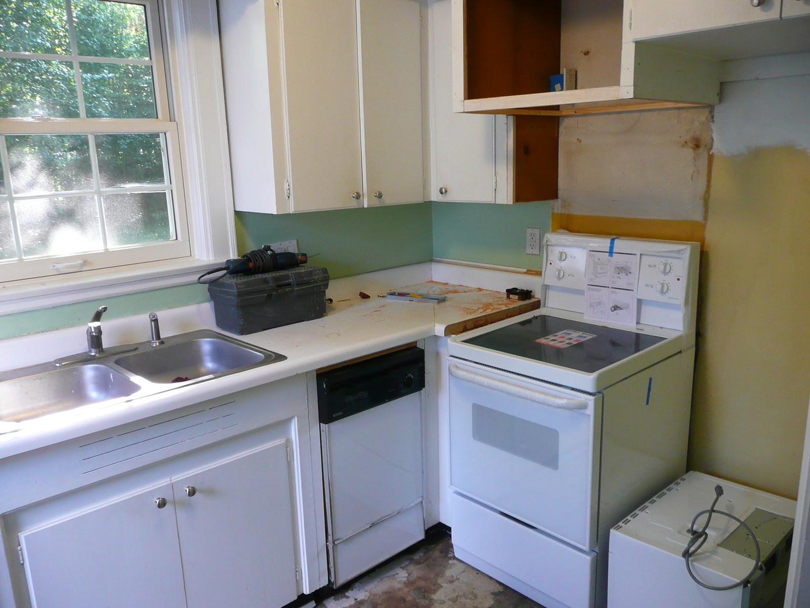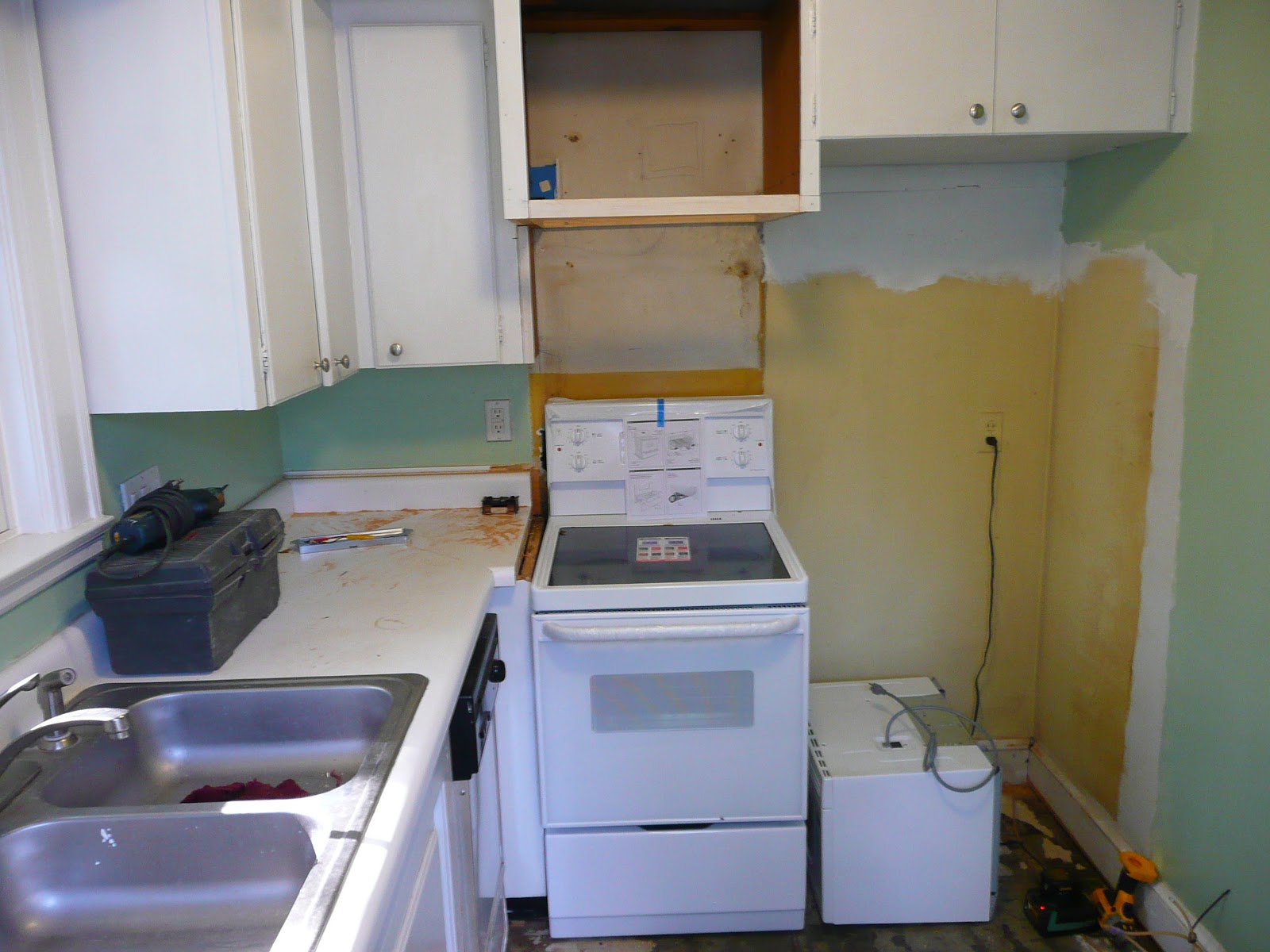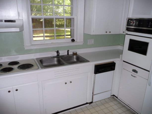 The oven is shown on the far right here with the microwave built in above it and an unused hot water heater below. The stove is across the room on the left side with cabinet below it. The sink was a very shallow sink with gross leaky faucets. The white counter top had years of stains and lack of cleaning It also had to go. There was a lot left to be desired in this kitchen.