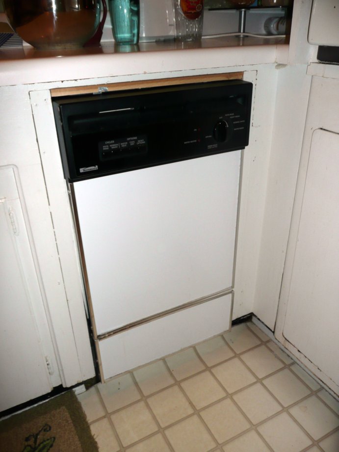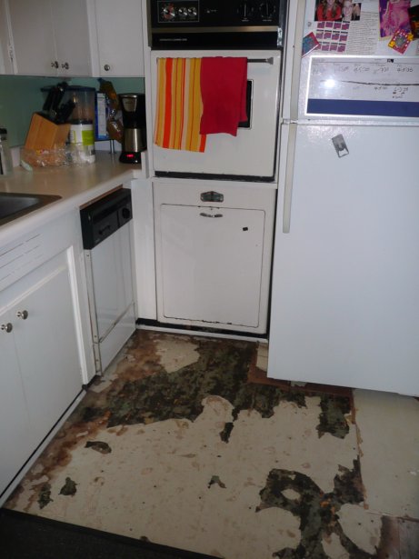 See that curling piece of linoleum flooring under the dishwasher? In the summer of 2009, I took Eric to get Mexican food one night and after a margarita, convinced him we should cut into the floor and see if there were hardwoods underneath. Devious, I know.