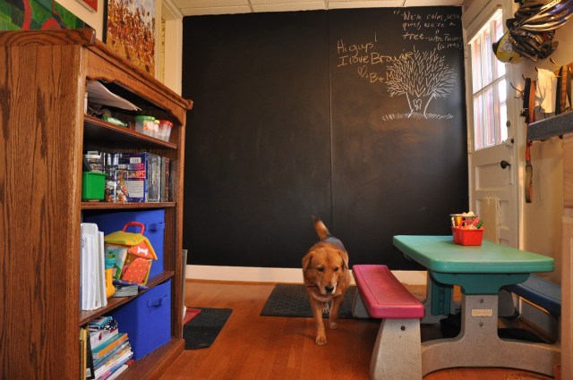 I love that the skeptic was the first to draw on the new chalkboard wall. These days, Greta enjoys making her dots and lines on the chalkboard wall, though dumping the chalk and putting them back in the bucket is usually more fun. Still, it’s a fun space now that our friends and their children alike enjoy writing or drawing on when they come to visit.
