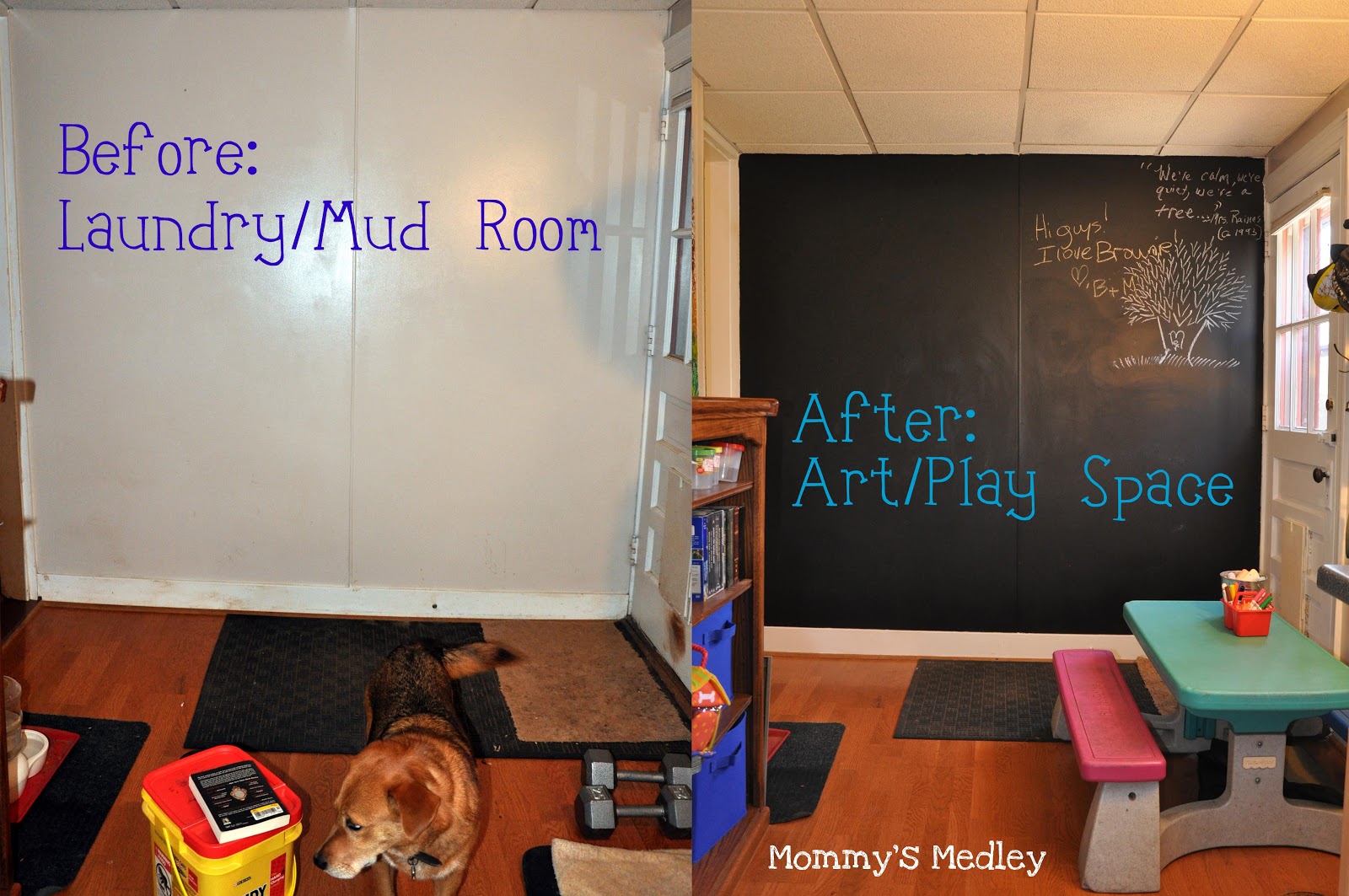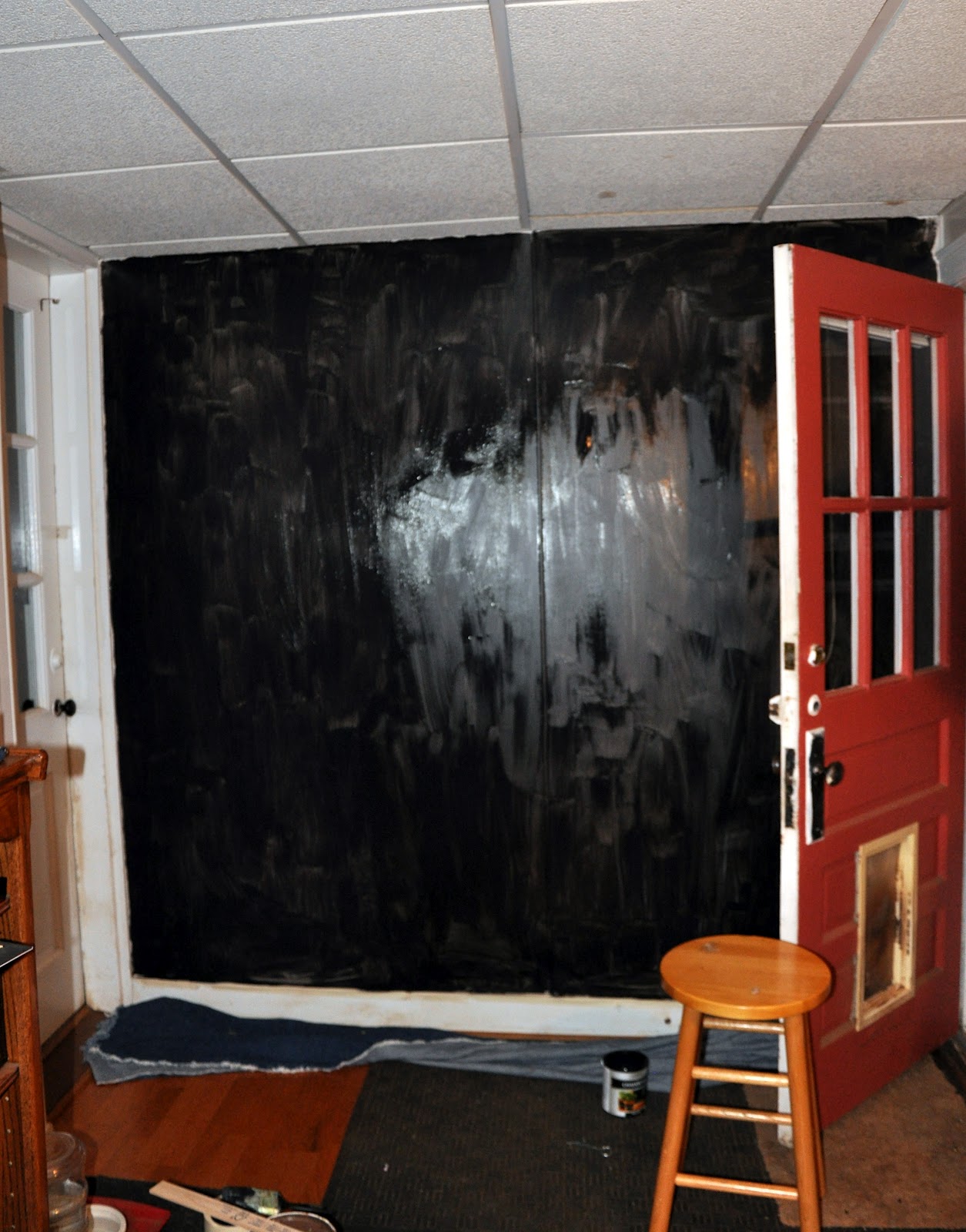 After a deep cleaning, the chalkboard paint went up. Eric had a quick panic moment due to miscommunication. He thought that I was going to paint only a small section of the wall with the chalkboard paint. Oops! I repainted the trim and the insides of both doors with a gloss white. Added bonus: the new gloss paint surface makes cleaning up North Carolina dirt a breeze.