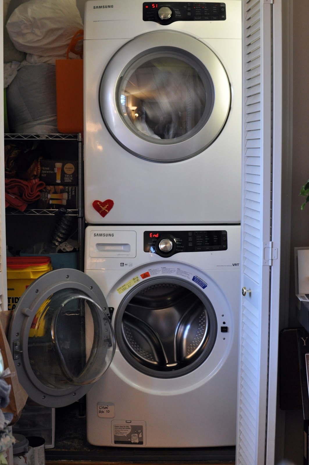 It is also the laundry room. We stacked ours and put a wire shelf in the laundry closet to give us more space.